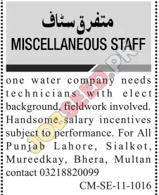 A Water Company, Lahore Punjab Pakistan invites applications from eligible candidates for the post of Technician as per advertisement of 01 December, 2025, published in Jang Newspaper. Diploma educational qualification will be preferred.