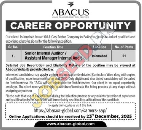 Abacus Global, Islamabad Islamabad Pakistan invites applications from eligible candidates for the post of Senior Internal Auditor / Assistant Manager Internal Audit as per advertisement of 07 December, 2025, published in Jang Newspaper. Bachelor educational qualification will be preferred.