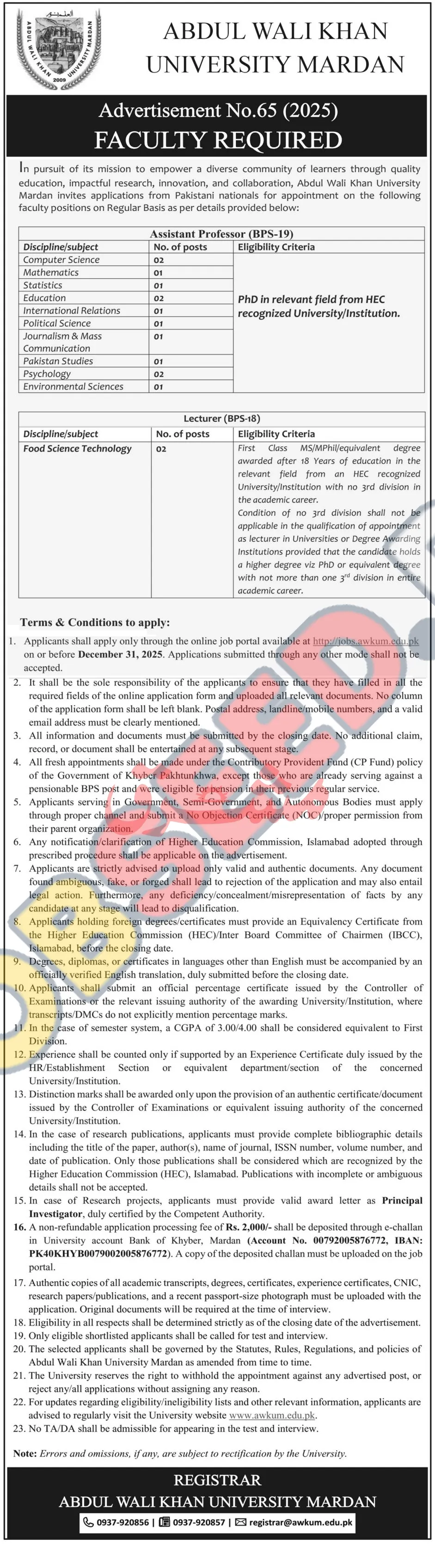 Abdul Wali Khan University, Mardan Khyber Pakhtunkhwa KPK Pakistan invites applications from eligible candidates for the post of Assistant Professor, Assistant Professor, Assistant Professor, Assistant Professor, Assistant Professor, Assistant Professor, Assistant Professor, Assistant Professor, Assistant Professor, Assistant Professor and Lecturer as per advertisement of 03 December, 2025, published in Mashriq Newspaper. PhD, Master educational qualification will be preferred.