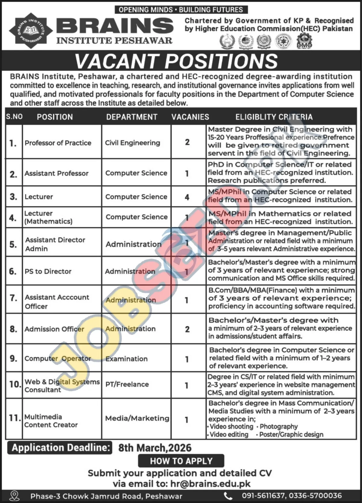 BRAINS Institute Peshawar, a reputable chartered and HEC-recognized institution, is announcing exciting vacant positions for both academic and administrative staff. This is a significant opportunity for dedicated professionals to join a dynamic educational environment committed to excellence in teaching, research, and institutional governance. We are looking for individuals who are passionate about contributing to the growth and development of higher education in Pakistan.