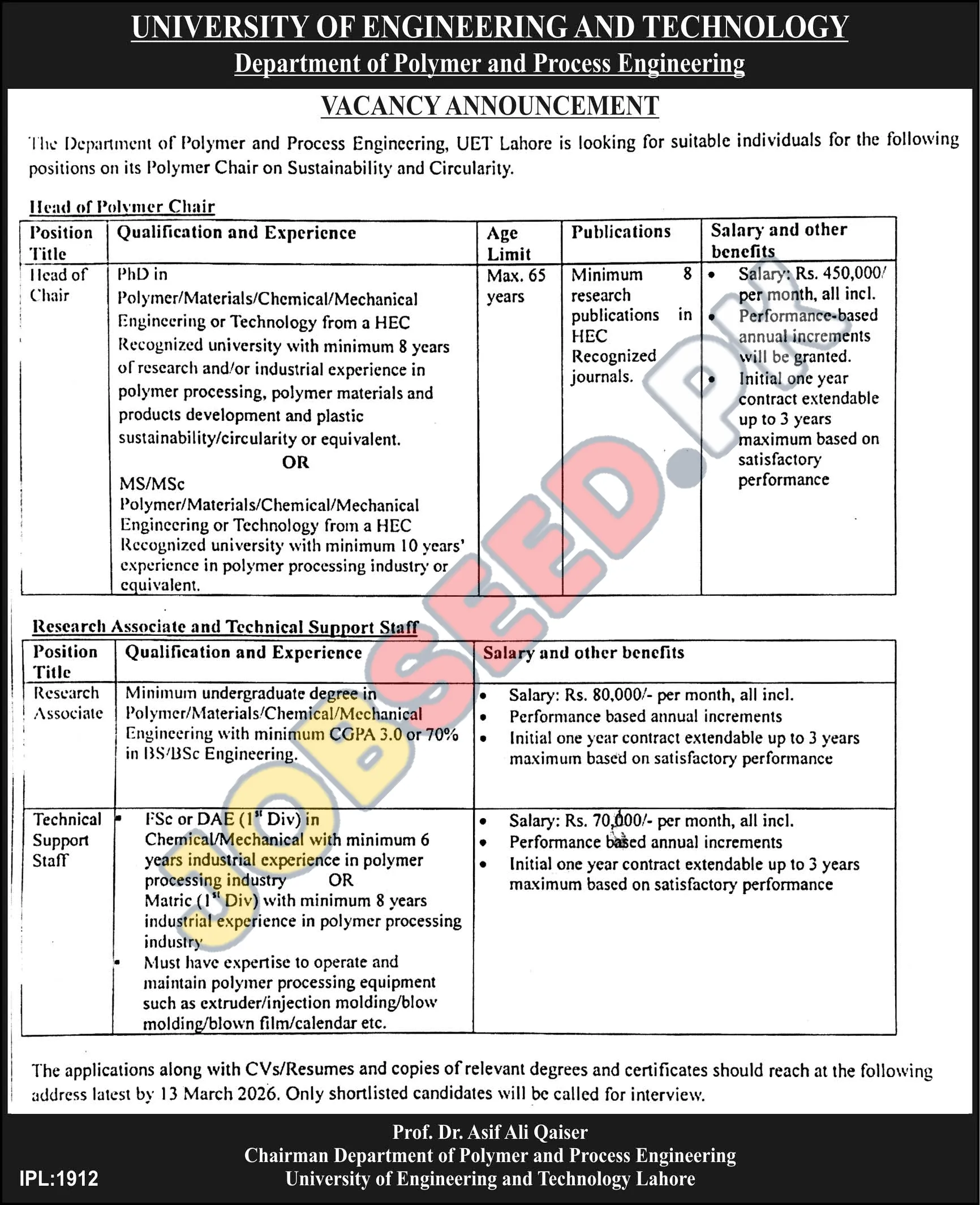 UET Lahore's Department of Polymer and Process Engineering announces vacancies for academic and research roles focused on sustainability and circularity. Ideal candidates will possess advanced degrees and relevant industrial or research experience. These positions offer attractive remuneration and opportunities for career advancement in a leading public sector university. Discover new career paths in polymer engineering and process technology.