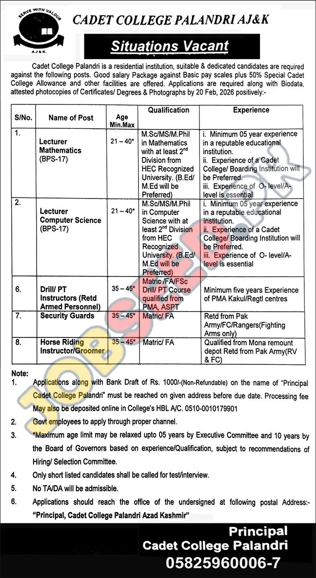 Cadet College Palandri, a prominent residential institution, is announcing exciting career opportunities for qualified and motivated individuals. This government sector organization is committed to providing a high-quality educational experience and is seeking to fill several key positions. Successful candidates will benefit from a competitive remuneration package, including basic pay scales, college allowances, and other attractive facilities. We are particularly looking for individuals to fill roles such as Lecturer in Mathematics, Lecturer in Computer Science, Drill/PT Instructors (Retired Armed Personnel), Security Guards, and Horse Riding Instructor/Groomer. This is an excellent chance for professionals to advance their careers in a respected educational setting.