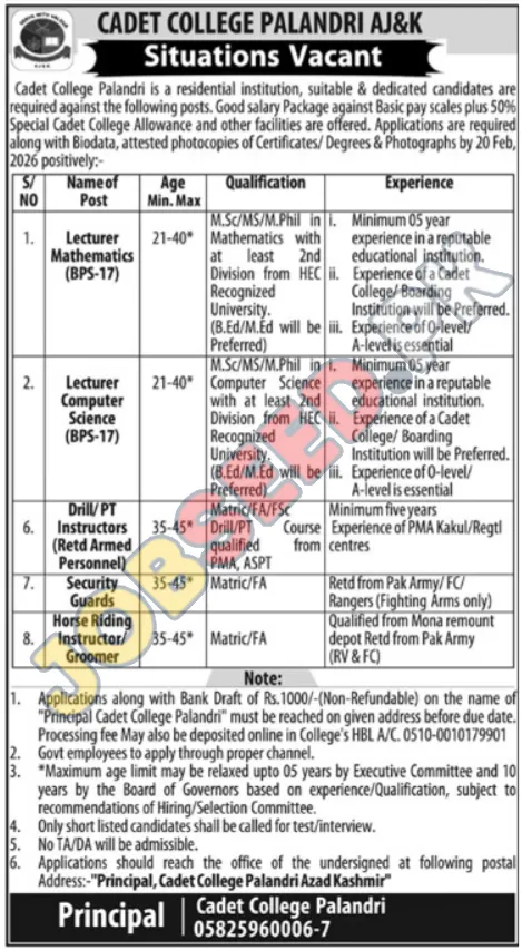 | Job Hiring Organization: | Cadet College Palandri |