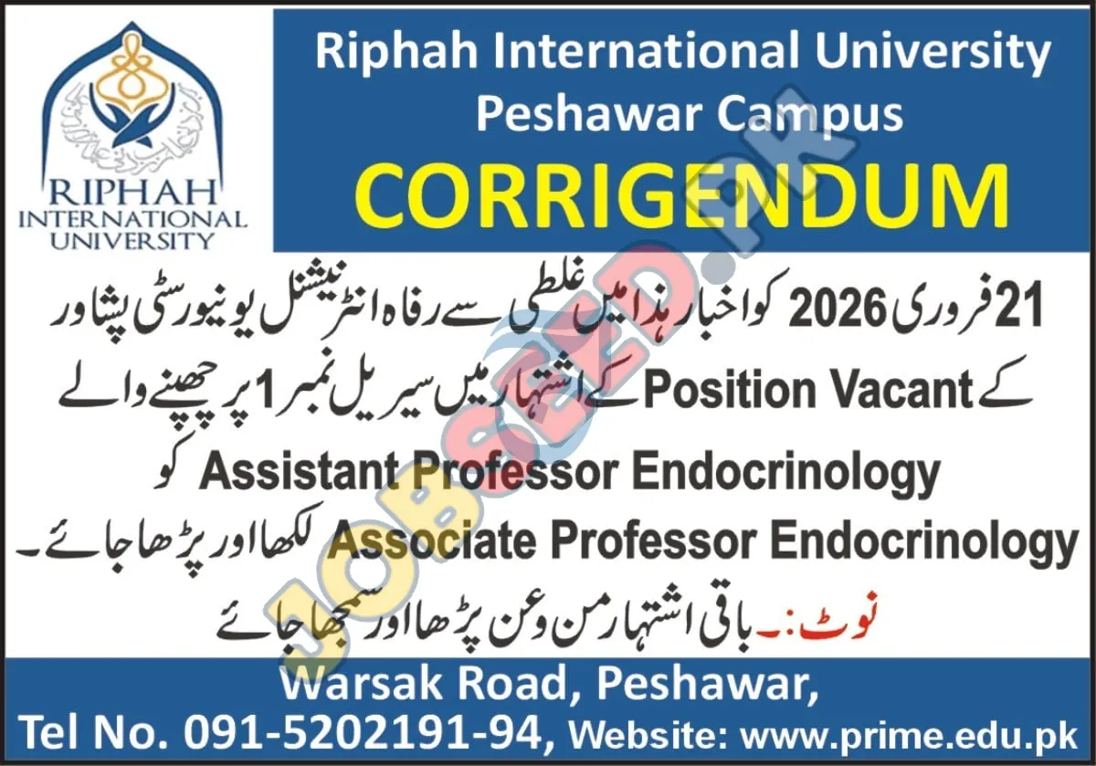 This corrigendum from Riphah International University, Peshawar Campus, addresses an error in a prior publication dated February 21, 2026. The university is actively recruiting for academic positions, specifically seeking faculty members for its Endocrinology department. Successful candidates will benefit from these hiring. This presents a significant career advancement opportunity for professionals in the medical education sector. Discover faculty vacancies and explore academic career paths within a reputable private university.