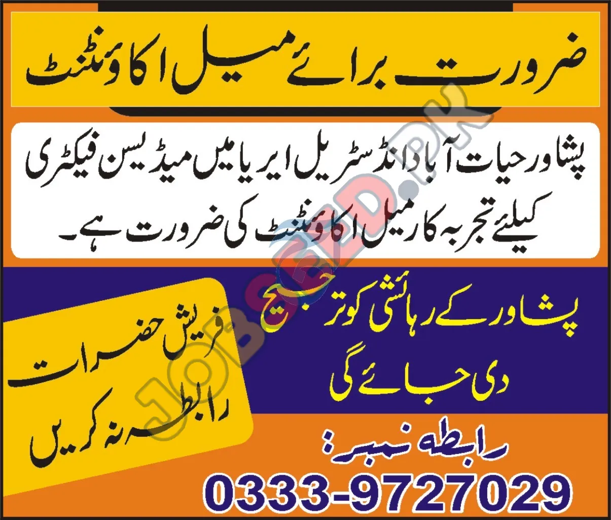 Medicine Factory is now recruiting in Peshawar Khyber Pakhtunkhwa. Apply for the position of Accountant. The required qualification is Bachelor. This role is within the Accounting industry. A bachelor degree is preferred. The application process commenced on 19 November, 2025 via Aaj Newspaper. Interested and eligible candidates must submit their applications before the deadline on 18 December, 2025. This is a prime opportunity to join a renowned organization. For a step-by-step application guide and full eligibility criteria, please see the official advertisement on https://www.jobseed.pk.