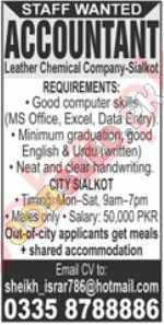 Chemical Company is now recruiting in Sialkot. Apply for the position of Accountant. The required qualification is Bachelor. This role is within the Management industry. A bachelor degree is preferred. The application process commenced on 23 November, 2025 via Jang Newspaper. Interested and eligible candidates must submit their applications before the deadline on 22 December, 2025. This is a prime opportunity to join a renowned organization. For a step-by-step application guide and full eligibility criteria, please see the official advertisement on https://www.jobseed.pk.