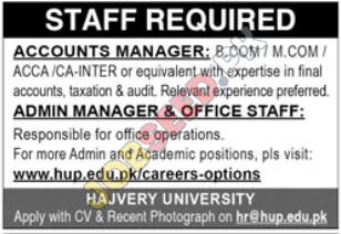 Hajvery University is inviting applications for the positions of Accounts Manager and Admin staff. These opportunities are available in the private sector and offer a pathway for Accountants and office professionals to advance their careers. With competitive remuneration and a focus on professional development, Hajvery University provides a dynamic work environment for those looking for a stable and rewarding career.