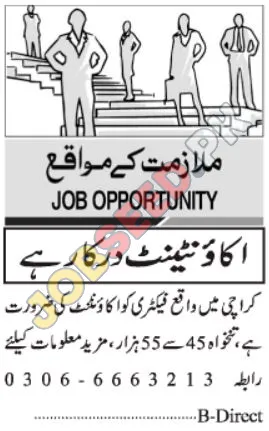 B-Direct, a well-established private sector company, is currently hiring an Accountant for their factory in Karachi. This presents an excellent chance to contribute to a growing organization and advance your accounting career. The Accountant will play a crucial role in maintaining financial records and ensuring accurate reporting. This role offers a competitive salary and the potential for professional growth. The ideal candidate will have strong analytical skills and a solid understanding of accounting principles.