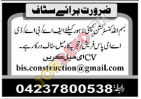 Accountant & Staff Positions Available at BIS Construction, Lahore