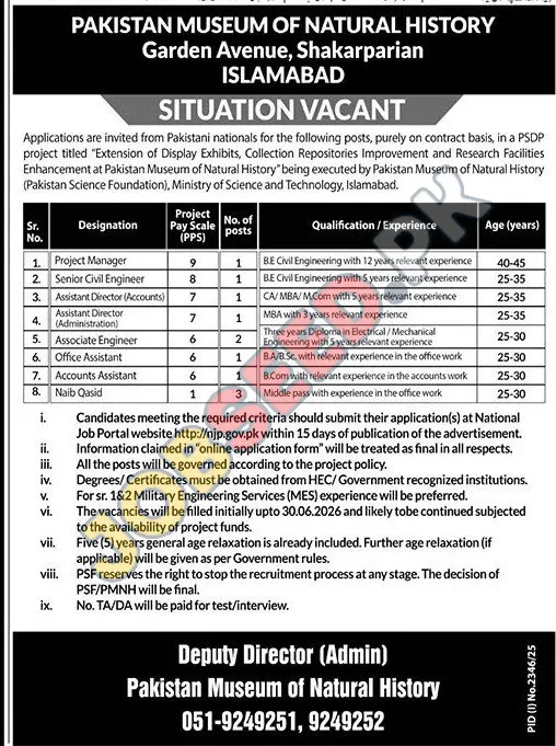 The Pakistan Museum of Natural History in Islamabad is seeking talented individuals for various positions on a contract basis. This initiative is part of the "Extension of Display Exhibits, Collection Repositories Improvement and Research Facilities Enhancement" project, supported by the Pakistan Science Foundation and the Ministry of Science and Technology.