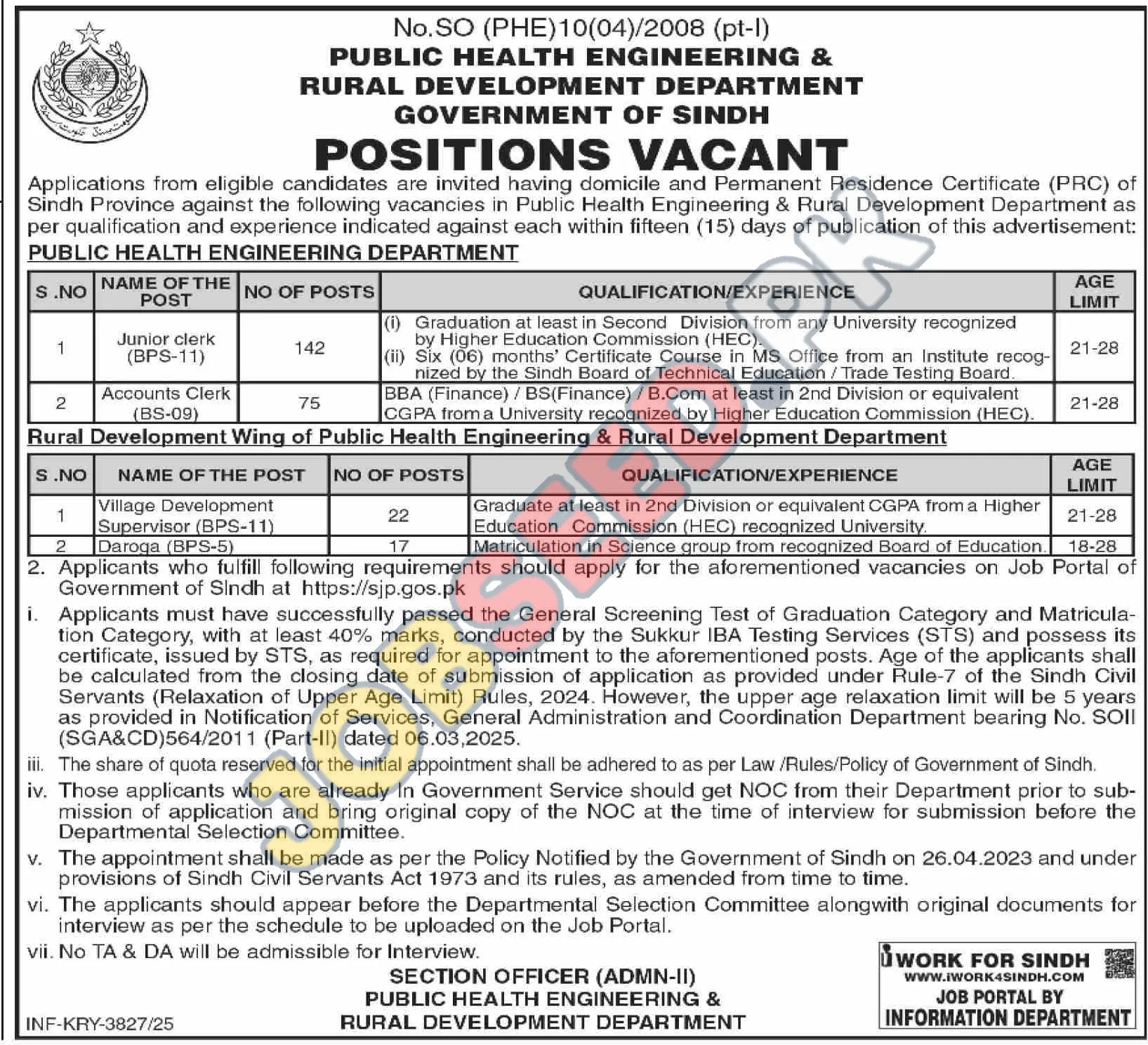 The Public Health Engineering & Rural Development Department, Government of Sindh, has announced multiple vacancies. Applications are invited from eligible candidates who possess a domicile and Permanent Residence Certificate (PRC) of Sindh Province.