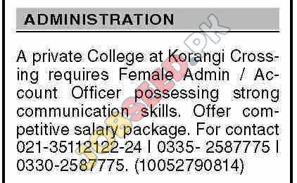 A reputable private College located at Korangi Crossing is seeking a dedicated and skilled Female Admin/Account Officer to join their team. This role offers a competitive salary package and the chance to contribute to a dynamic educational environment. If you have strong communication skills and are looking for a rewarding career, we encourage you to apply.