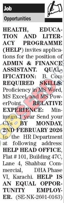 HEALTH, EDUCATION AND LITERACY PROGRAMME (HELP), a private sector entity, is hiring an Admin & Finance Assistant. This role requires proficiency in MS Word, Excel, and PowerPoint. Successful candidates will benefit from these competitive salary. The position offers a good opportunity for career growth in the non-profit sector. Candidates must possess a B.Com qualification and one year of relevant experience. This latest job opening by HELP offers a platform for professional development and contributing to a meaningful cause.