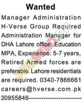 H-Verse Group is seeking a highly qualified and experienced Administration Manager to join their team in DHA Lahore. This is a significant career opportunity for individuals with a strong background in management and administration, particularly those with experience from retired armed forces. The role requires a minimum of 5 to 7 years of relevant professional experience and an MPA qualification.