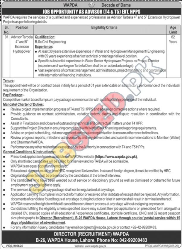 WAPDA, a government entity, is hiring experienced Advisors for its Tarbela 4th and 5th Extension Hydropower Projects in Lahore. The ideal candidate will have extensive experience in water and hydropower management, with a focus on project monitoring and risk optimization. This contract-based position offers a competitive salary and the chance to contribute to a major infrastructure development initiative. High CPC Additionally, private sector careers are available for qualified candidates.