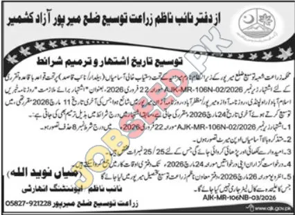 Government job openings for Agriculture Extension Officer in Mirpur, Azad Kashmir, Pakistan. This role focuses on agricultural development and expansion projects. Ideal for individuals seeking a career in public sector agriculture, offering opportunities for professional growth and contribution to the community. The advertisement highlights specific requirements for applicants interested in government employment within the agricultural domain.