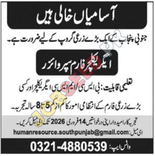 Agriculture Farm Supervisor Career Opportunities in South Punjab