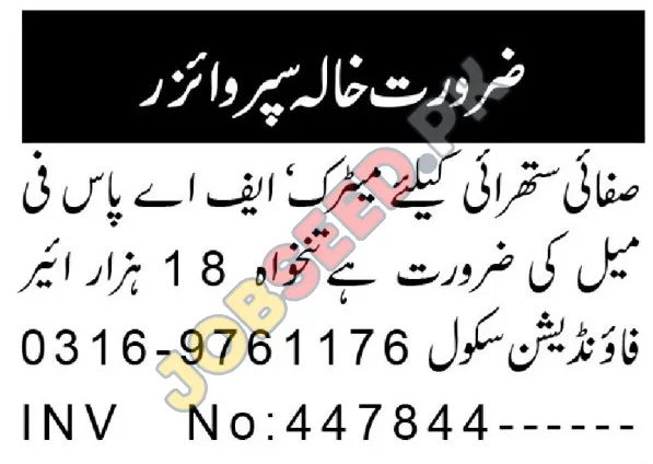 Join the team at Air Foundation School System in Peshawar Khyber Pakhtunkhwa, Khyber Pakhtunkhwa KPK. They are seeking to hire 2 qualified individuals for the roles of Supervisor and Sanitation Worker. This is a Full-Time position. This career opportunity was advertised on 11 December, 2025 in Aaj Newspaper. The last date to apply is 02 January, 2026. Don't miss this chance to advance your career with Air Foundation School System. For more information and to apply online, visit https://www.jobseed.pk.