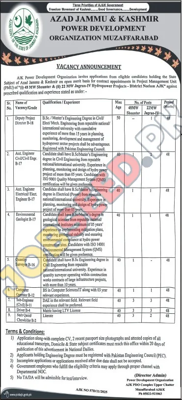Join the team at AJK Power Development Organization in Muzaffarabad, AJK. They are seeking to hire 9 qualified individuals for the roles of Deputy Project Director, Assistant Engineer Civil, Assistant Engineer Electrical, Environmental Geologist, Quantity Surveyor, Computer Operator, Sub-Engineer, Driver and Naib Qasid. This is a Full-Time position. This career opportunity was advertised on 27 November, 2025 in Mahasib Newspaper. The last date to apply is 17 December, 2025. Don't miss this chance to advance your career with AJK Power Development Organization. For more information and to apply online, visit https://www.jobseed.pk.