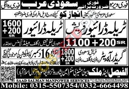 Al Faisal & Malik Heavy Machinery Center, Riyadh Saudi Arabia Pakistan invites applications from eligible candidates for the post of Trailer Driver, Grader Operator and Trailer Driver Fresh as per advertisement of 13 December, 2025, published in Express Newspaper. Middle educational qualification will be preferred.