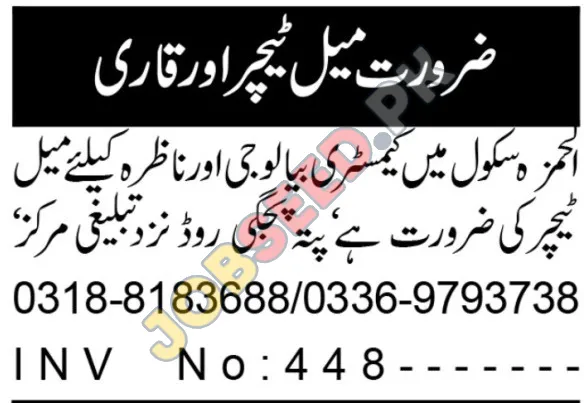 Al Hamza School, located near Tablighi Markaz, Pungi Road, is seeking passionate and qualified male teachers. This is a fantastic chance to contribute to a thriving educational environment. The school is looking for teachers specialized in Chemistry, Biology, and for Nazira. This is a great opportunity to begin or continue your teaching career in a supportive academic setting.