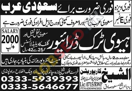 Al Sheikh Corporation, Riyadh Saudi Arabia Pakistan invites applications from eligible candidates for the post of Heavy Truck Driver as per advertisement of 07 December, 2025, published in Express Newspaper. Primary educational qualification will be preferred.