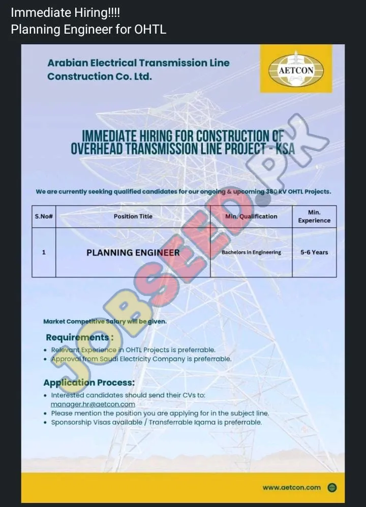 Arabian Electrical Transmission Line Construction Co. Ltd., Riyadh invites applications from eligible candidates for the post of Planning Engineer as per advertisement of 15 December, 2025. BE educational qualification will be preferred.