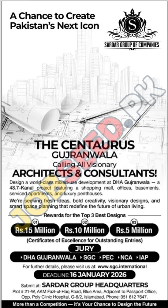 The Sardar Group of Companies is now recruiting in Islamabad. Apply for the position of Architect. The required qualification is Bachelor. This role is within the Management industry. A bachelor degree is preferred. The application process commenced on 29 October, 2025 via Jang Newspaper. Interested and eligible candidates must submit their applications before the deadline on 16 January, 2026. This is a prime opportunity to join a renowned organization. For a step-by-step application guide and full eligibility criteria, please see the official advertisement on https://www.jobseed.pk.