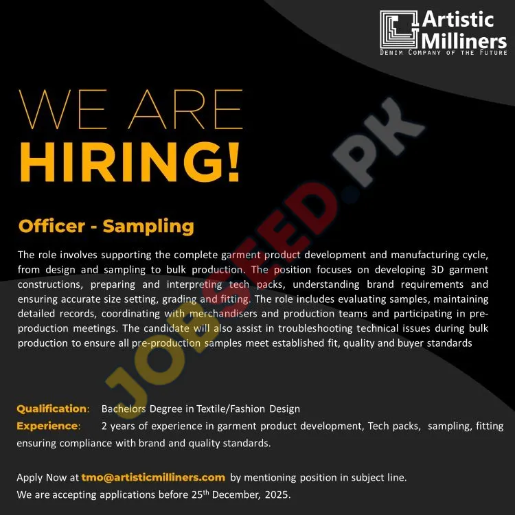 Apply at Artistic Milliners, latest jobs in Sampling Officer department before closing date which is around 25 December, 2025 or as per closing date in newspaper ad. Read complete ad online to know how to apply on latest Artistic Milliners job opportunities. For Further details visit https://www.jobseed.pk.