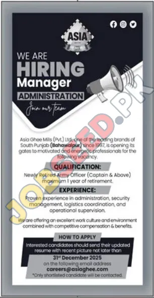 Asia Ghee Mills Pvt Limited, Quetta Balochistan Pakistan invites applications from eligible candidates for the post of Manager Administration as per advertisement of 14 December, 2025, published in Jang Newspaper. Bachelor educational qualification will be preferred.