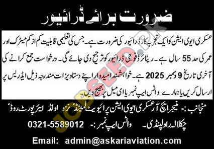 Askari Aviation Pvt Ltd, Rawalpindi Punjab Pakistan invites applications from eligible candidates for the post of Driver as per advertisement of 07 December, 2025, published in Express Newspaper. Matric educational qualification will be preferred.
