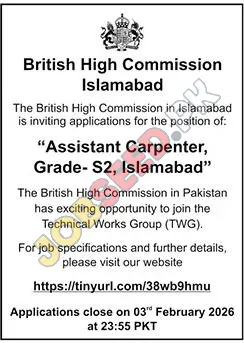 The British High Commission in Islamabad has announced a vacancy for an Assistant Carpenter within its Technical Works Group. This role presents excellent career opportunities for skilled professionals aspiring to secure government sector employment. If you are seeking a stable job with scope for professional growth, this is the right place. Apply now to begin your career journey.