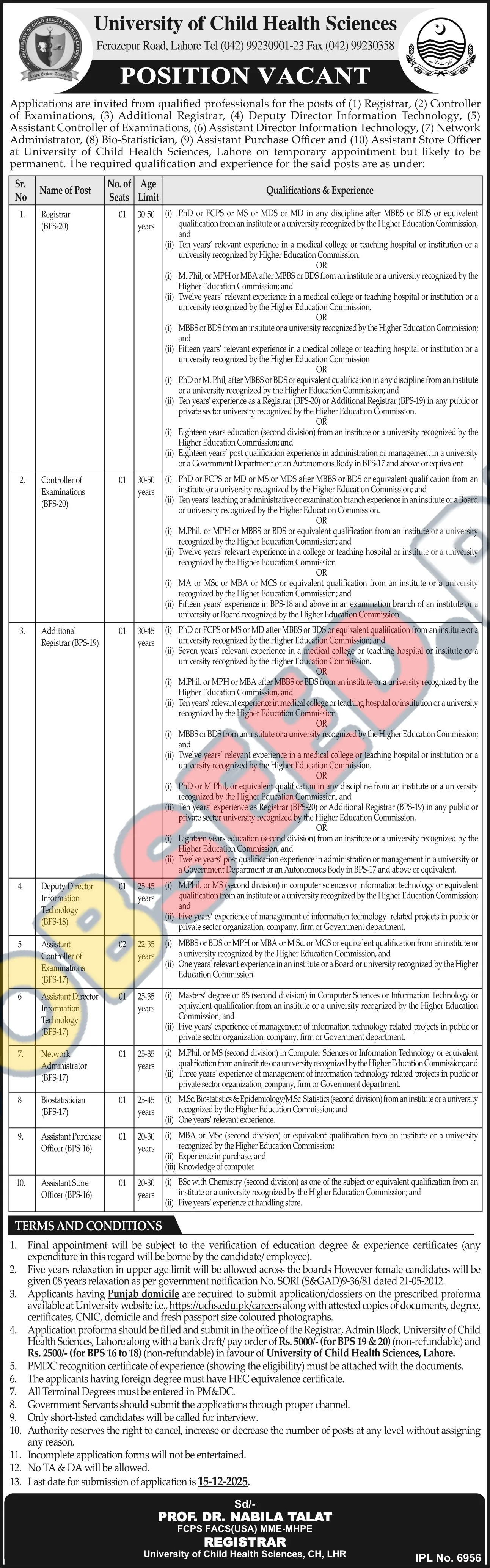 The University of Child Health Sciences, Lahore, is seeking dedicated and qualified professionals to join its esteemed faculty and administrative teams. We have multiple positions available, ranging from Registrar to Assistant Store Officer, each offering a unique opportunity to contribute to the advancement of child health and education. These roles are initially on a temporary basis but are likely to become permanent, providing long-term career growth for the right individuals.