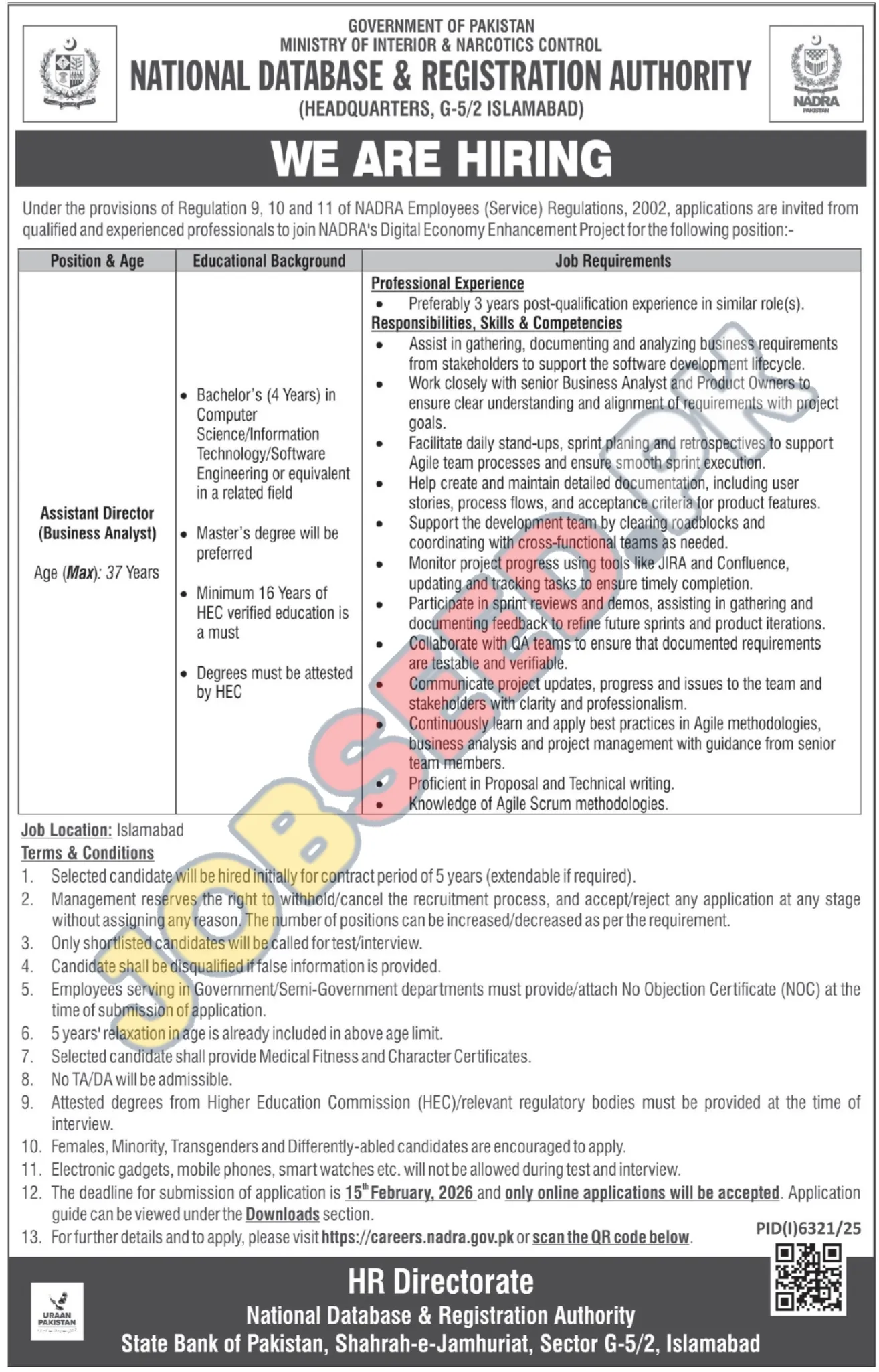 The National Database & Registration Authority (NADRA), a premier government organization, has announced exciting career opportunities for the position of Assistant Director (Business Analyst) in Islamabad. This role is crucial for those in government jobs seeking to be part of the Digital Economy Enhancement Project. This position offers a competitive salary and excellent prospects for professional growth within a significant public-sector organization. Applicants must have relevant experience and a Bachelor's degree.
