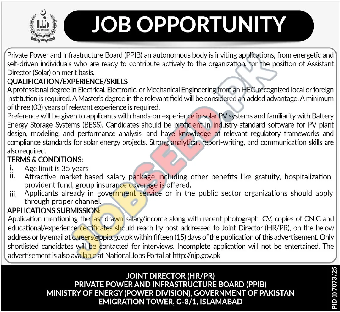 The Government of Pakistan's Private Power and Infrastructure Board (PPIB) is offering an exciting career opportunity for an Assistant Director (Solar). This role requires a professional degree in Electrical, Electronic, or Mechanical Engineering and relevant experience. The position involves working on solar PV systems, battery energy storage systems (BESS), and related projects. With a competitive salary, the position offers exciting career pathways, making it a very appealing job for candidates who want to work for the government and grow professionally.