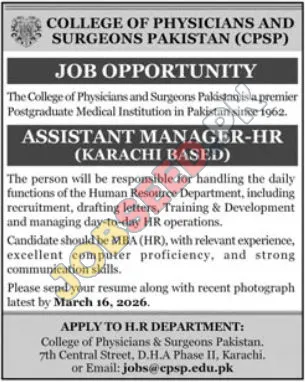 The College of Physicians and Surgeons Pakistan (CPSP), a well-established postgraduate medical institution, is currently hiring for the position of Assistant Manager HR. This presents a great career development in the public sector. The Assistant Manager will be based in Karachi and will play a critical role in managing several human resource functions. The ideal candidate will have strong communication skills and experience, looking for vacancies within their specialized field.