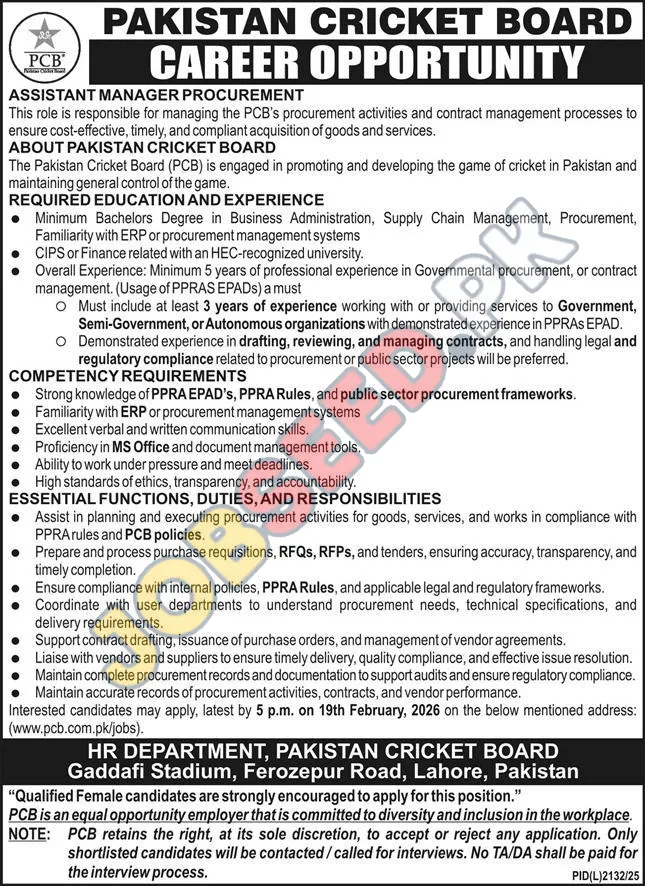 The Pakistan Cricket Board (PCB) is offering a significant career opportunity for an Assistant Manager Procurement. This role is crucial for managing the PCB's procurement activities and contract management processes, ensuring cost-effective, timely, and compliant acquisition of goods and services. The PCB is dedicated to promoting and developing the game of cricket in Pakistan and maintaining general control of the sport.