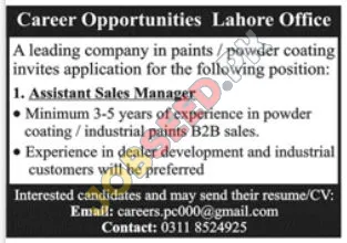 Explore new sales career opportunities in Lahore with a leading paints and powder coating company. The Assistant Sales Manager position requires 3-5 years of experience in industrial B2B sales and expertise in dealer development. Apply now for this full-time role in the private sector. Additionally, latest jobs are available for qualified candidates.