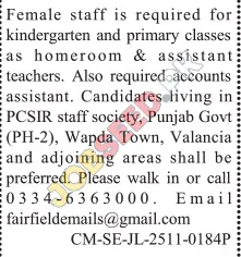 Candidates residing in PCSIR staff society, Punjab Govt (PH-2), Wapda Town, Valencia, and the surrounding areas are highly encouraged to apply due to convenient location. This is an excellent opportunity to contribute to a thriving educational environment.