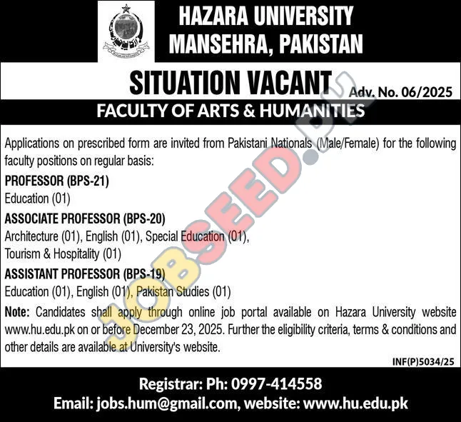 Hazara University is now recruiting in Mansehra Khyber Pakhtunkhwa. Apply for the position of Associate Professor. The required qualification is PhD. This role is within the Teaching industry. A postgraduate degree is preferred. The application process commenced on 29 November, 2025 via Express Newspaper. Interested and eligible candidates must submit their applications before the deadline on 23 December, 2025. This is a prime opportunity to join a renowned organization. For a step-by-step application guide and full eligibility criteria, please see the official advertisement on https://www.jobseed.pk.
