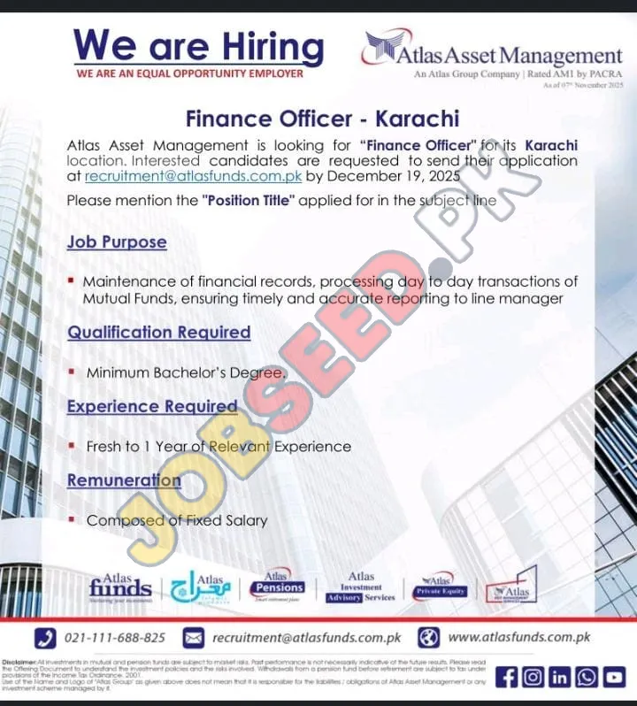 Atlas Asset Management, Karachi invites applications from eligible candidates for the post of Finance Officer as per advertisement of 15 December, 2025, published in Advertisement. BA educational qualification will be preferred.