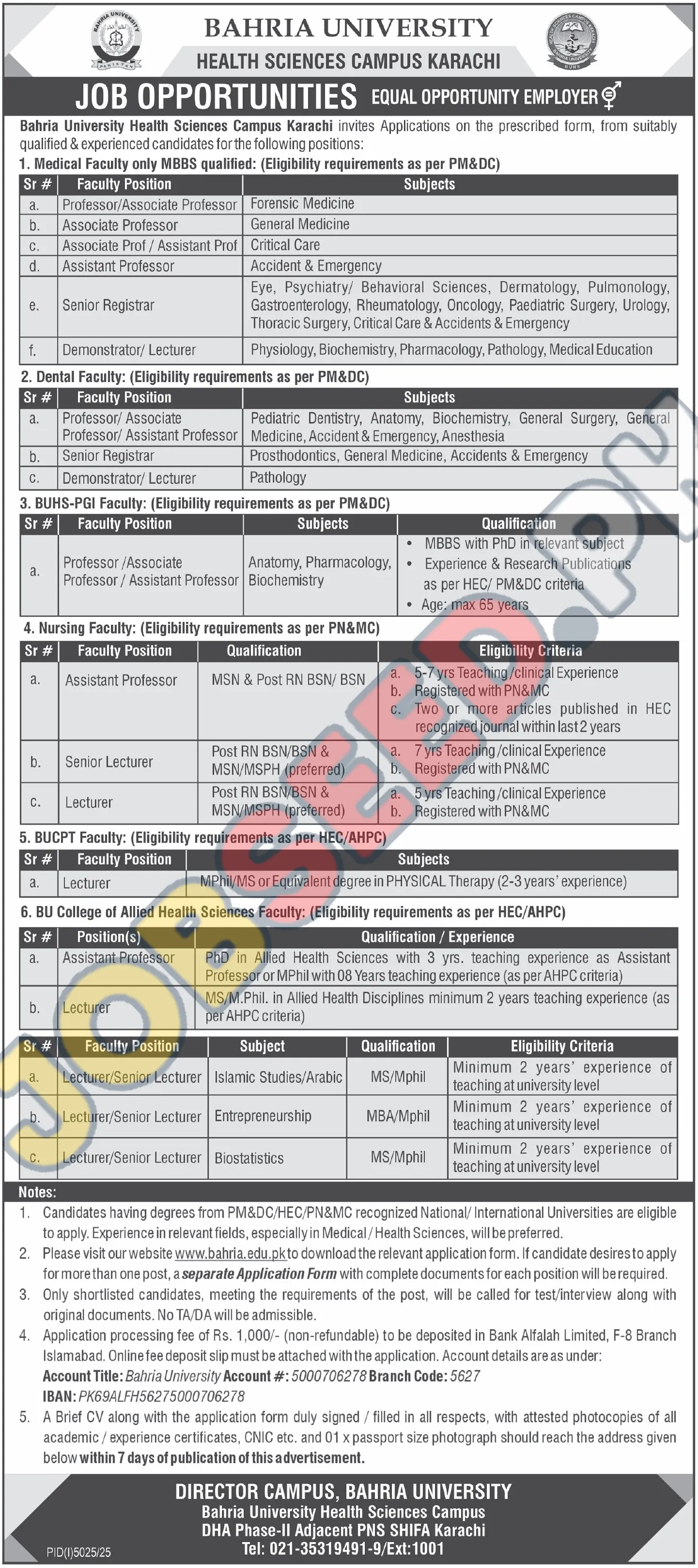 Bahria University, Karachi Sindh Pakistan invites applications from eligible candidates for the post of Professor/Associate Professor, Associate Professor, Associate Prof/ Assistant Prof, Assistant Professor, Senior Registrar, Demonstrator/ Lecturer, Professor/Associate, Professor/ Assistant Professor, Senior Registrar, Demonstrator/ Lecturer, Professor/Associate, Professor/Assistant Professor, Assistant Professor, Senior Lecturer, Lecturer, Lecturer, Assistant Professor, Lecturer, Lecturer/Senior Lecturer, Lecturer/Senior Lecturer and Lecturer/Senior Lecturer as per advertisement of 18 December, 2025, published in Tribune Newspaper. MBBS, PhD, BA educational qualification will be preferred.