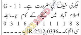 Bakery & Sweets, Islamabad Islamabad Pakistan invites applications from eligible candidates for the post of Bakery Chef as per advertisement of 12 December, 2025, published in Jang Newspaper. Matric educational qualification will be preferred.