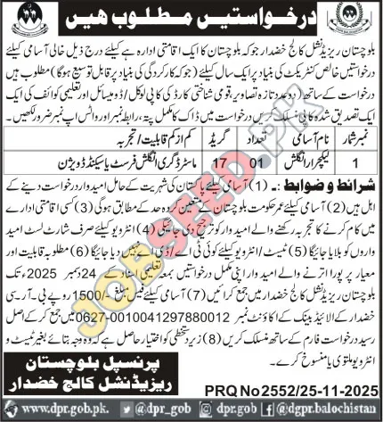 Balochistan Residential College, Khuzdar Balochistan Pakistan invites applications from eligible candidates for the post of Lecturer English as per advertisement of 26 November, 2025, published in Jang Newspaper. Master educational qualification will be preferred.