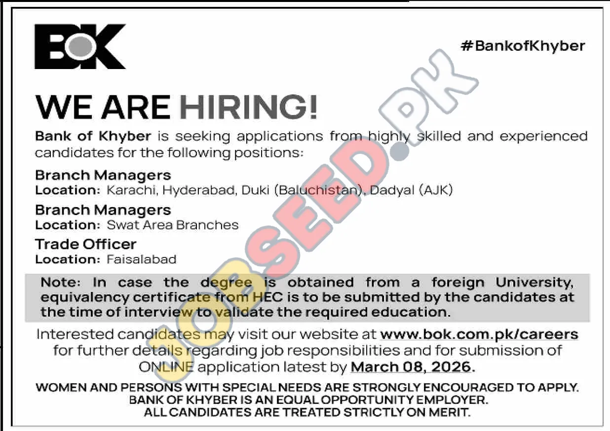 Discover new government job openings in Pakistan with Bank of Khyber. We are recruiting for Branch Managers in Karachi, Hyderabad, Duki, Dadyal, and Swat Area Branches, as well as Trade Officers in Faisalabad. This is a prime opportunity for individuals seeking a rewarding career in the banking sector. Learn about the essential qualifications, including degree equivalency requirements, and how to submit your online application before the March 08, 2026 deadline. Bank of Khyber offers a supportive work environment and promotes equal employment opportunities.