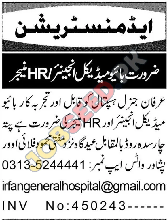 Irfan General Hospital, a prominent healthcare provider, is currently expanding its professional team and has announced immediate openings for a skilled Biomedical Engineer and a seasoned HR Manager. These positions are crucial for the hospital's commitment to delivering high-quality medical services and maintaining efficient administrative functions. This is an excellent opportunity for professionals seeking to advance their careers within the dynamic healthcare sector in Pakistan.