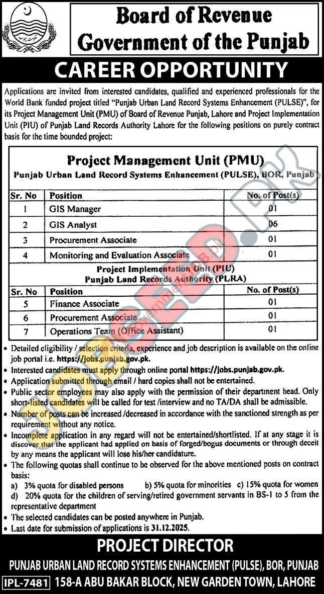 Board of Revenue (Punjab), Lahore invites applications from eligible candidates for the post of GIS Manager, GIS Analyst, Procurement Associate, Monitoring and Evaluation Associate, Finance Associate, Procurement Associate and Operations Team (Office Assistant) as per advertisement of 16 December, 2025. Bachelor, Intermediate educational qualification will be preferred.
