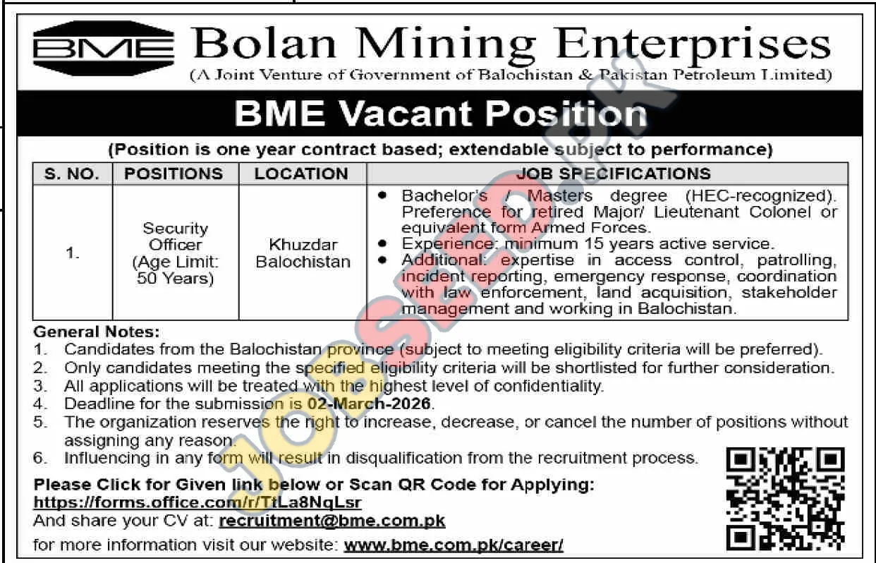 Bolan Mining Enterprises, a distinguished joint venture between the Government of Balochistan and Pakistan Petroleum Limited, is extending an invitation for skilled professionals to join its esteemed organization. We are currently seeking to fill a crucial role for a Security Officer, offering a one-year contract that is renewable based on satisfactory performance. This position is situated in Khuzdar, Balochistan, and presents a significant opportunity for individuals looking to contribute to a vital sector and advance their careers.