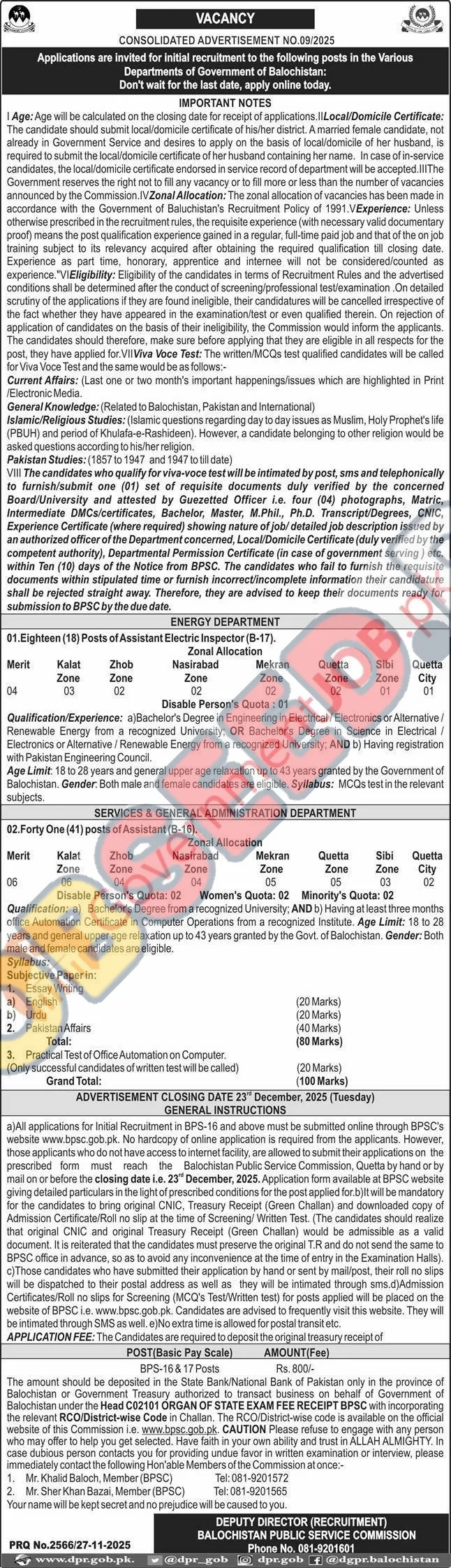 The Balochistan Public Service Commission (BPSC) announces opportunities for dedicated individuals to join various government departments. This recruitment drive aims to fill key positions within the Energy Department and the Services & General Administration Department. Candidates seeking stable and rewarding careers within the Balochistan government are encouraged to apply.