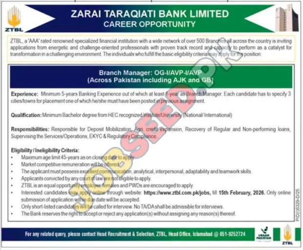 - Contact for Queries: For any related inquiries, please contact the Head Recruitment & Selection at ZTBL Head Office, Islamabad, via phone at 051-9252724.